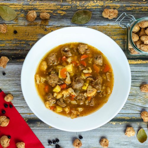 Dodamo dvakrat toliko vode, kot je vsebine v posodi, oziroma gostoto enolončnice prilagodimo po lastnih željah. Kuhamo še 10 minut in nato postrežemo.